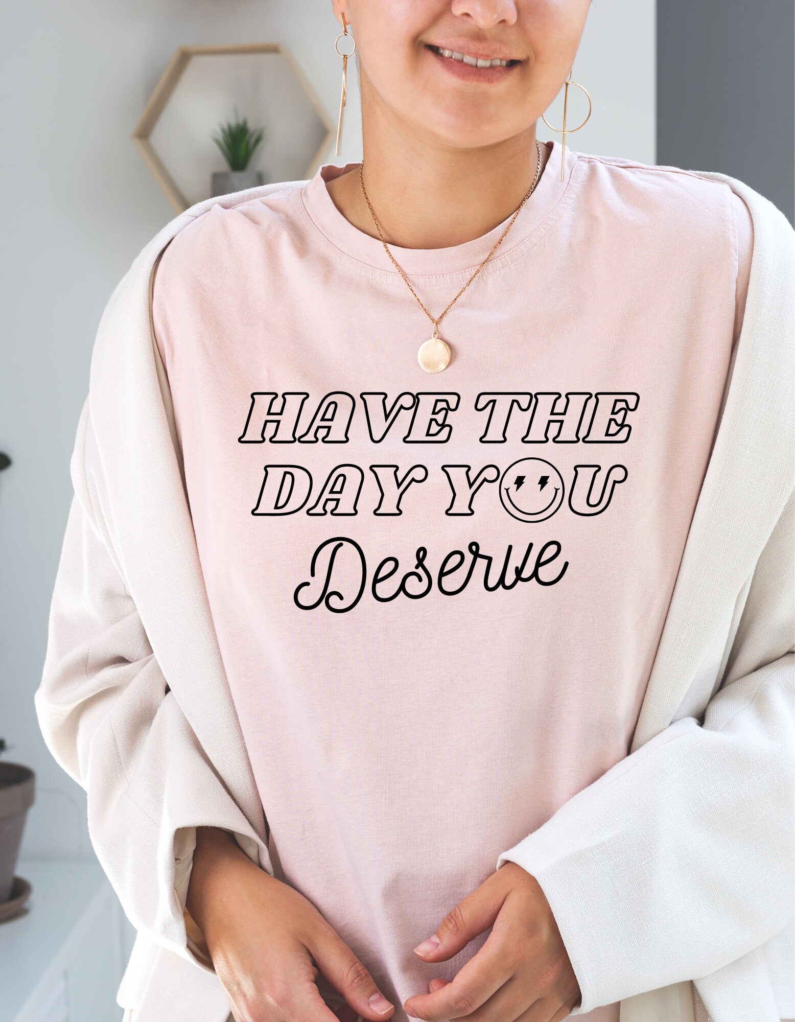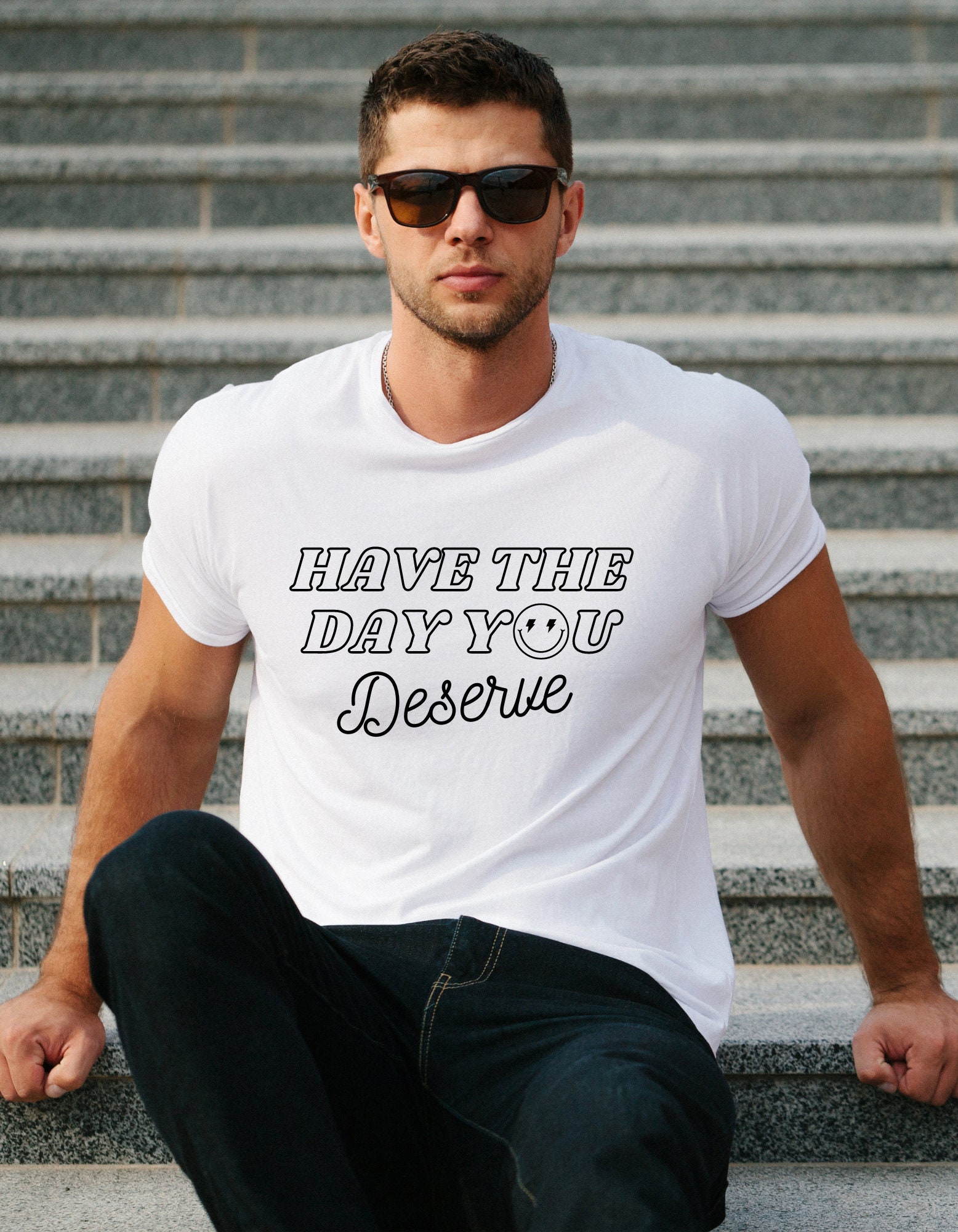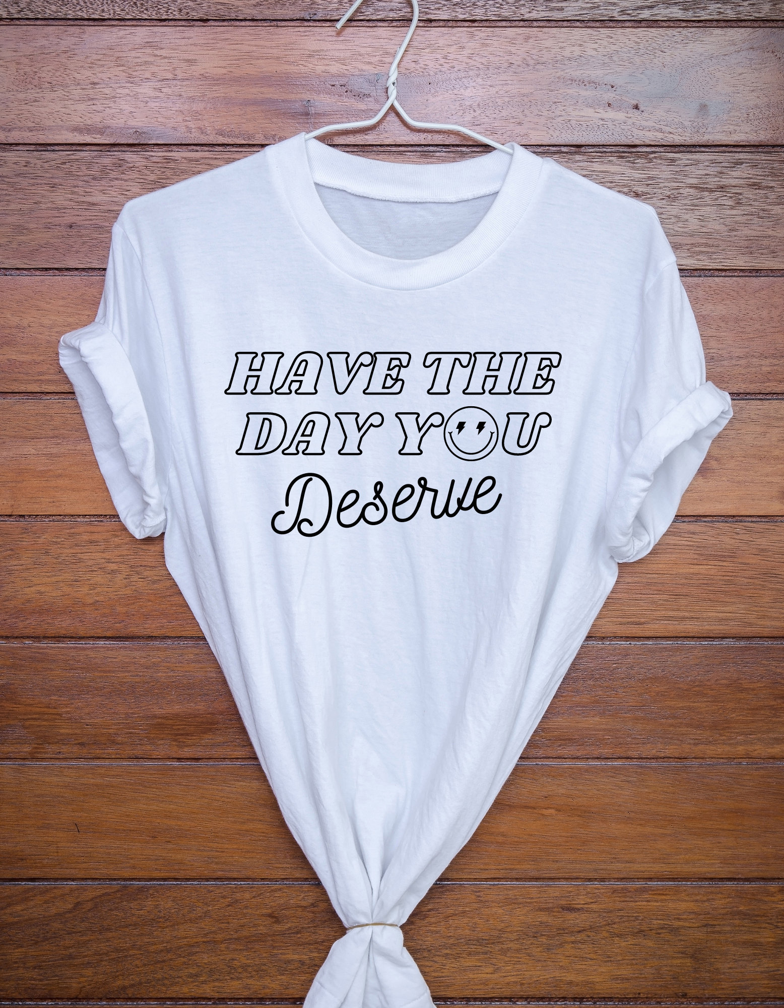 Have the day you deserve T-shirts, positive quote shirt for all the family ~ Youth Toddler Women's and Unisex. Smile face replacing the "O" with lighting bolts 🙂⚡