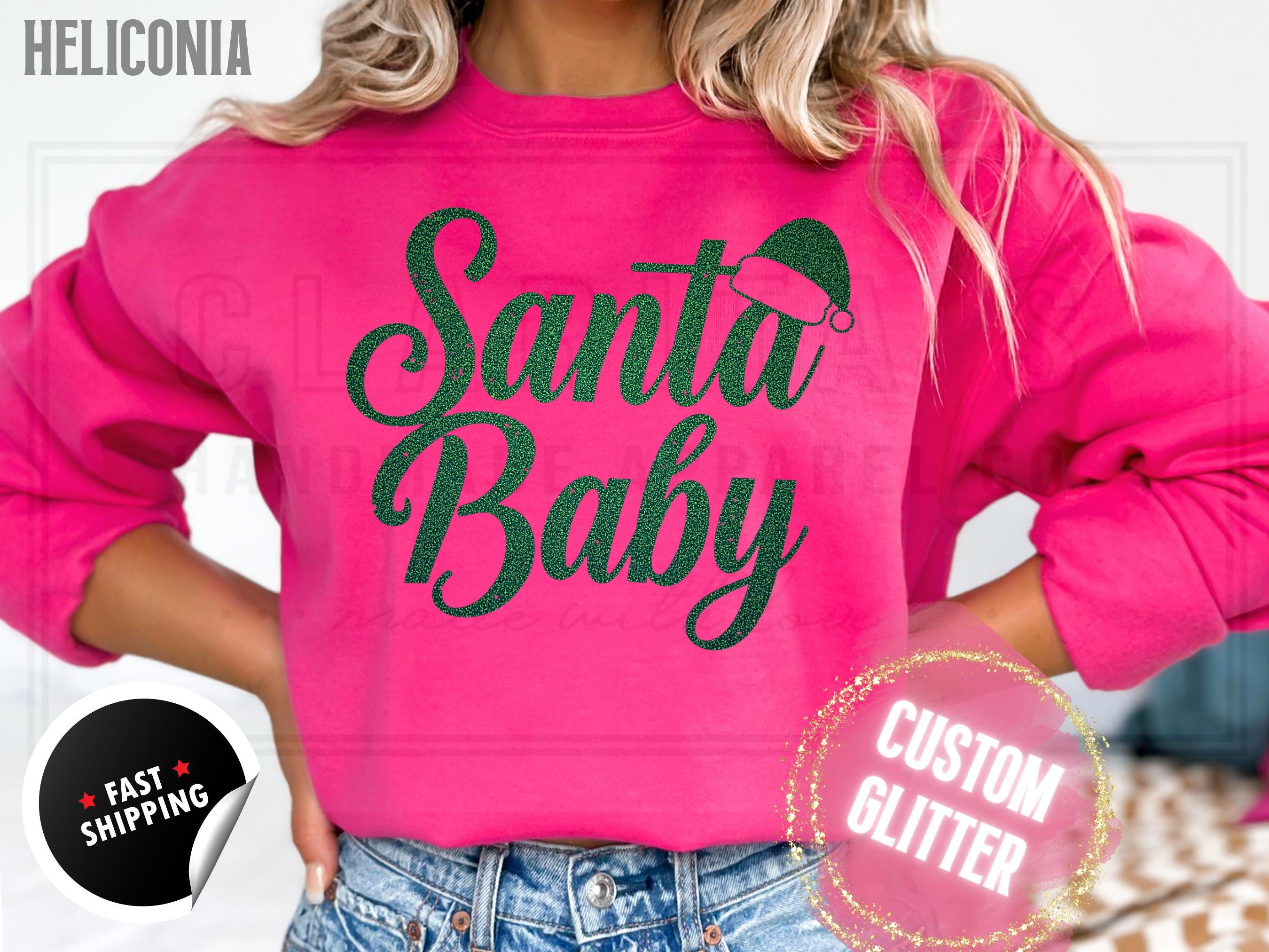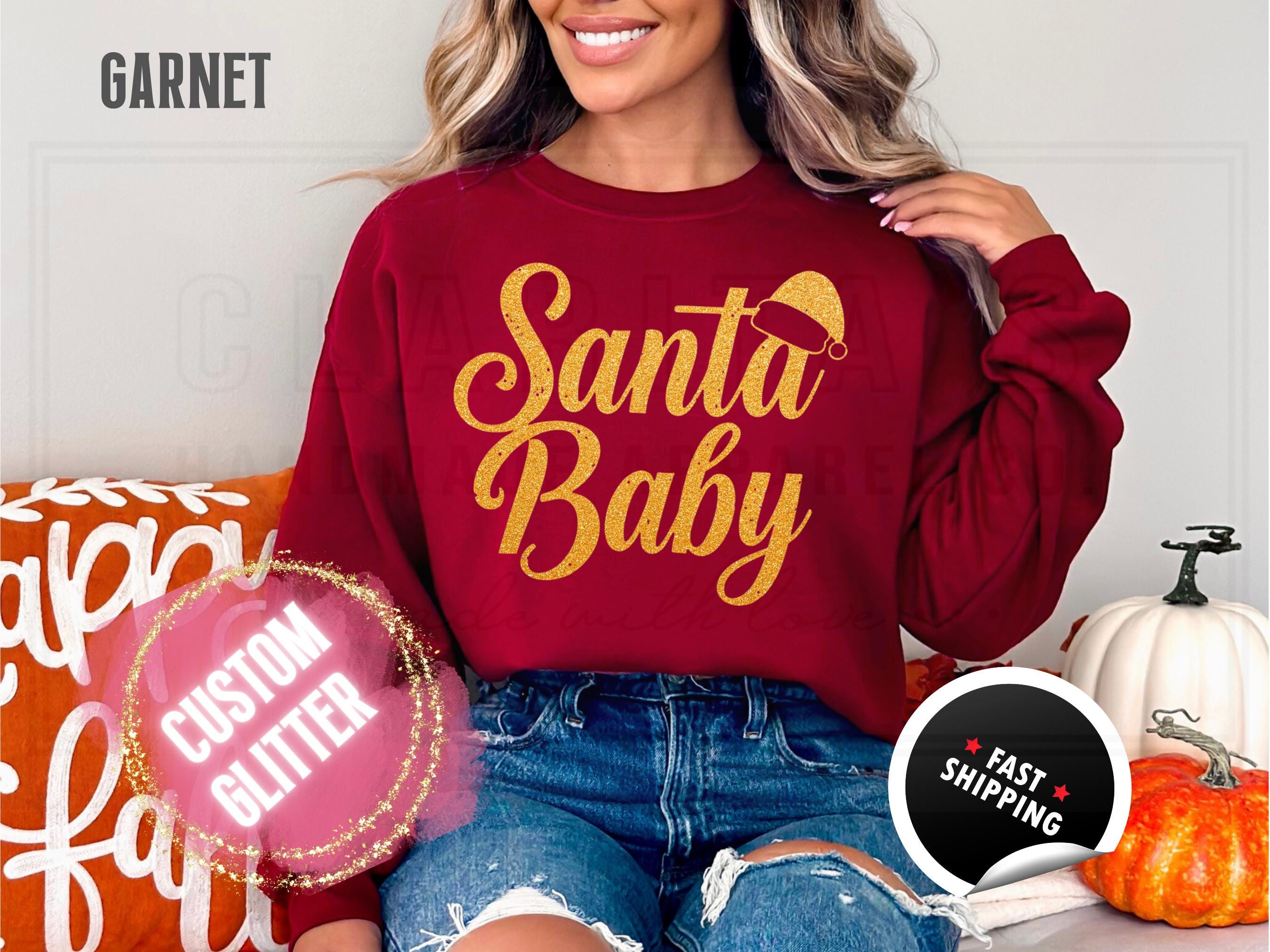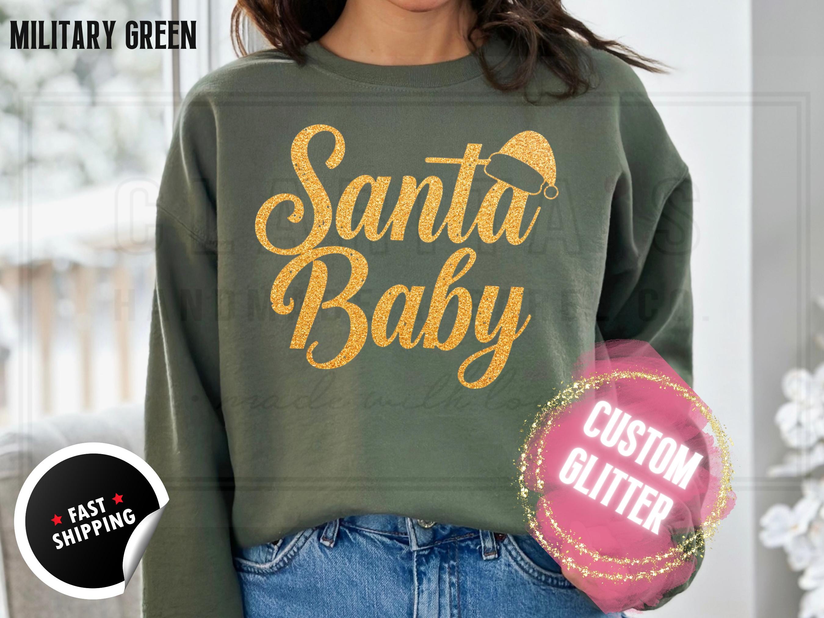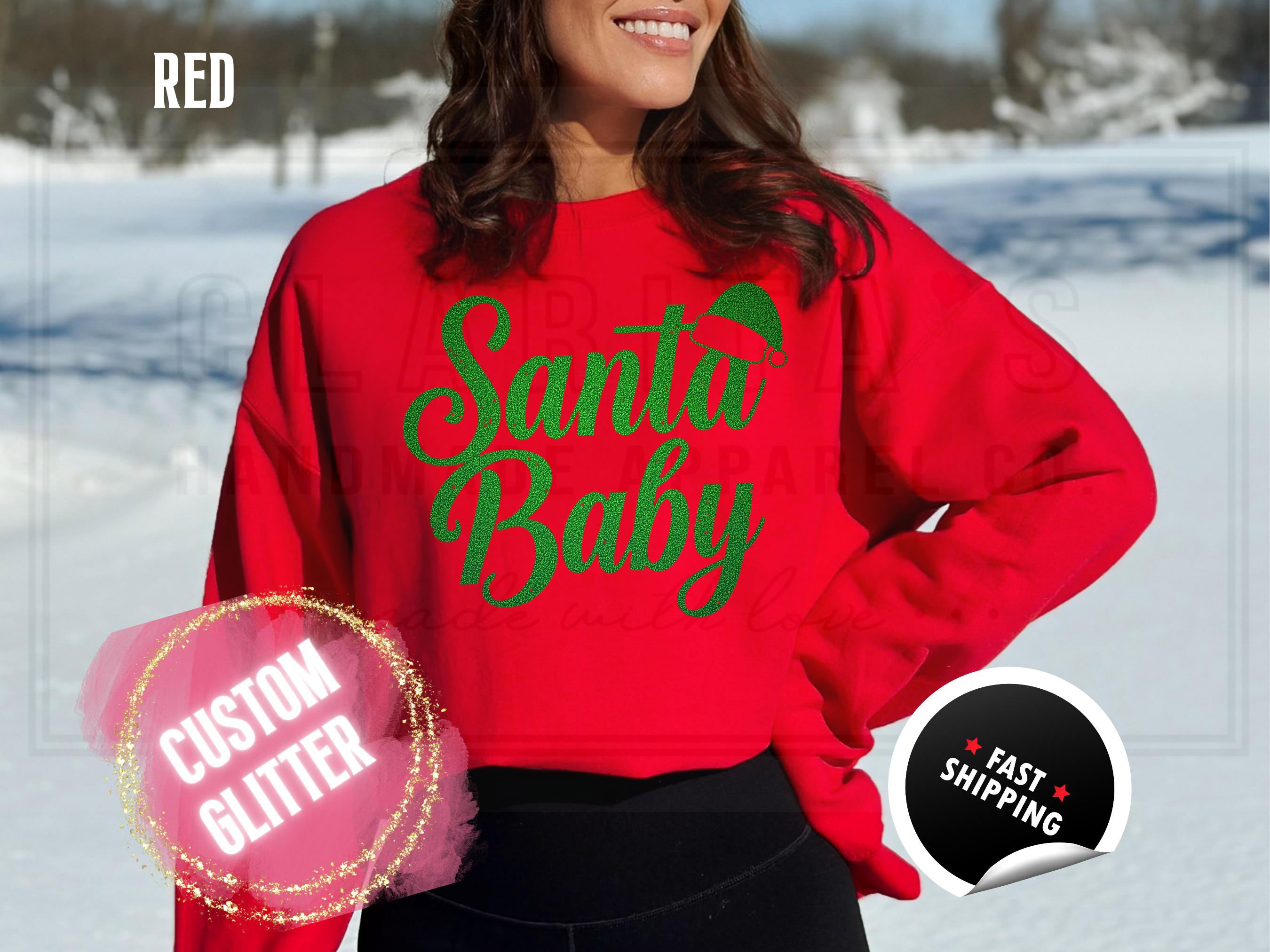 Glitter Christmas Sweatshirt and T-Shirts: ''Santa Baby" Holiday Crewneck Sweater. Custom Color Glitzy Sparkling Festive Shirts for Women