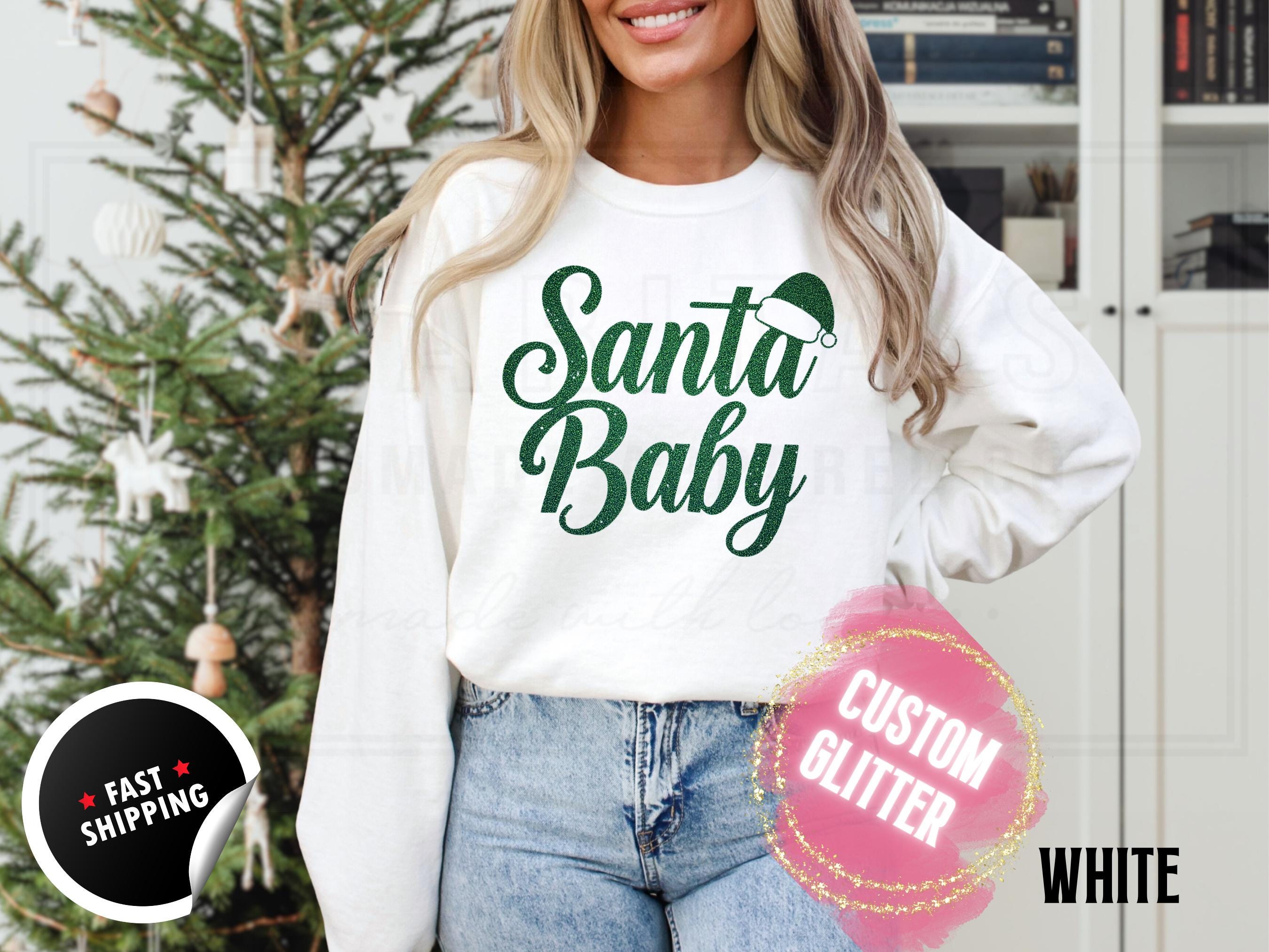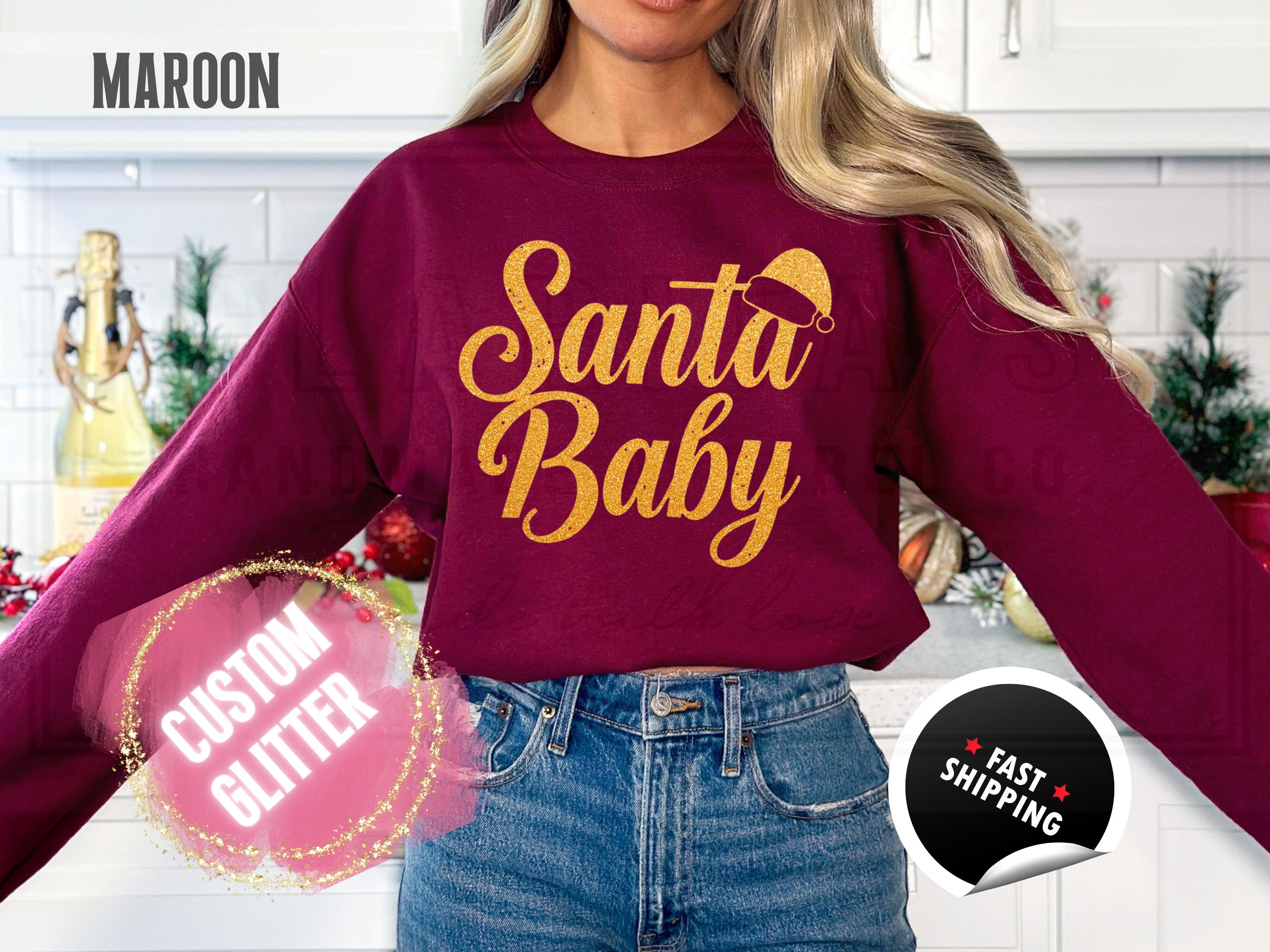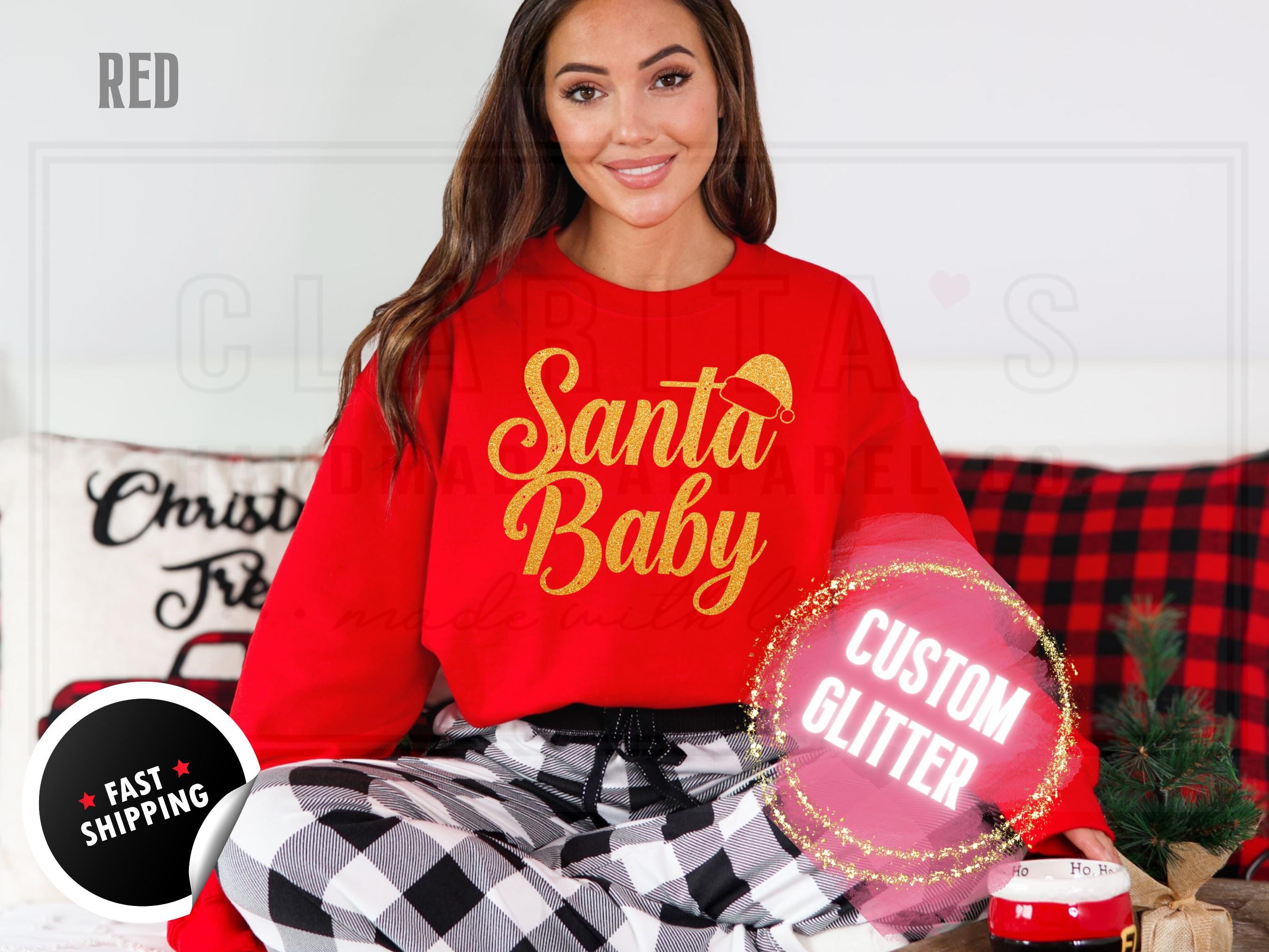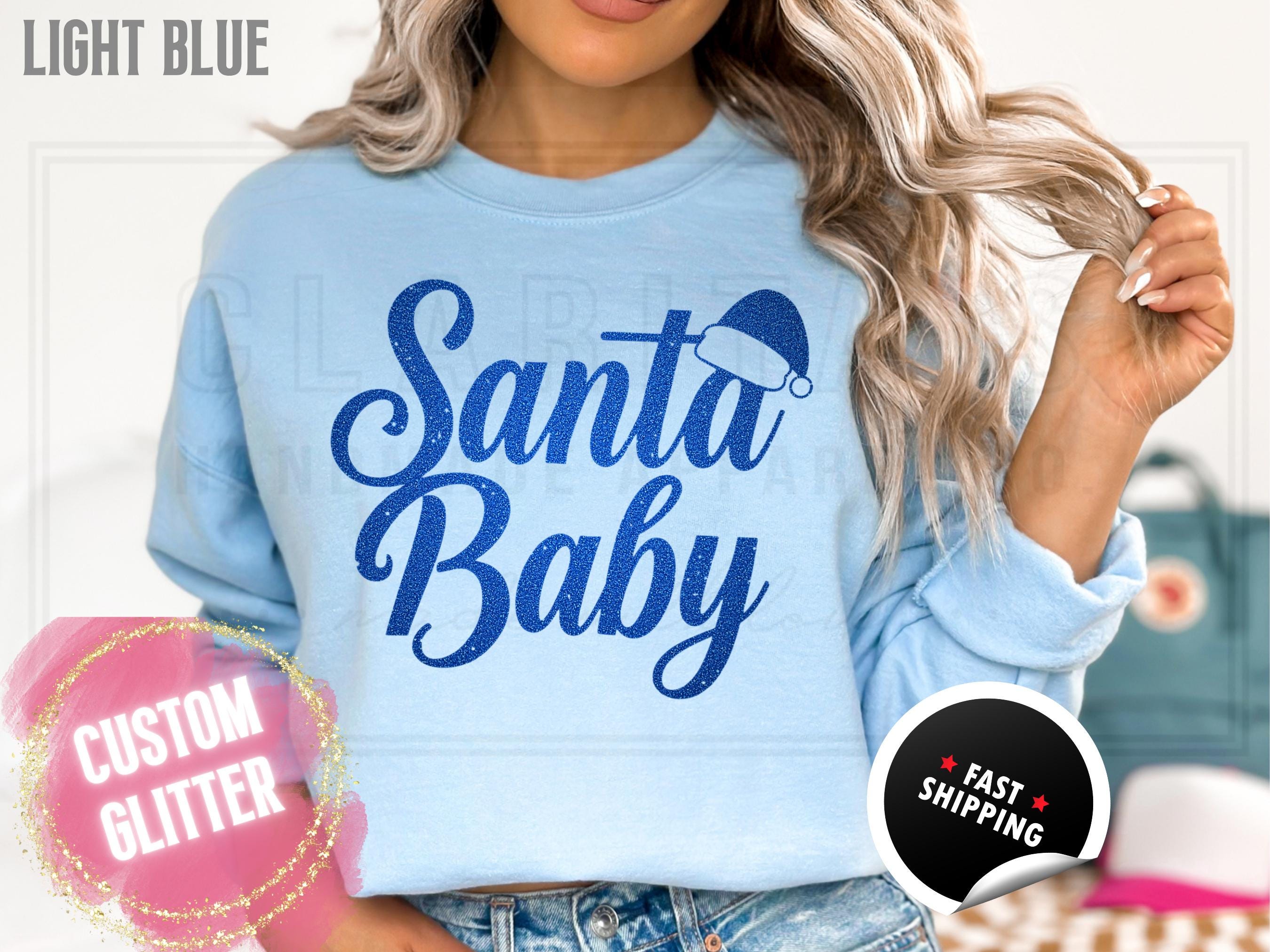 Glitter Christmas Sweatshirt and T-Shirts: ''Santa Baby" Holiday Crewneck Sweater. Custom Color Glitzy Sparkling Festive Shirts for Women