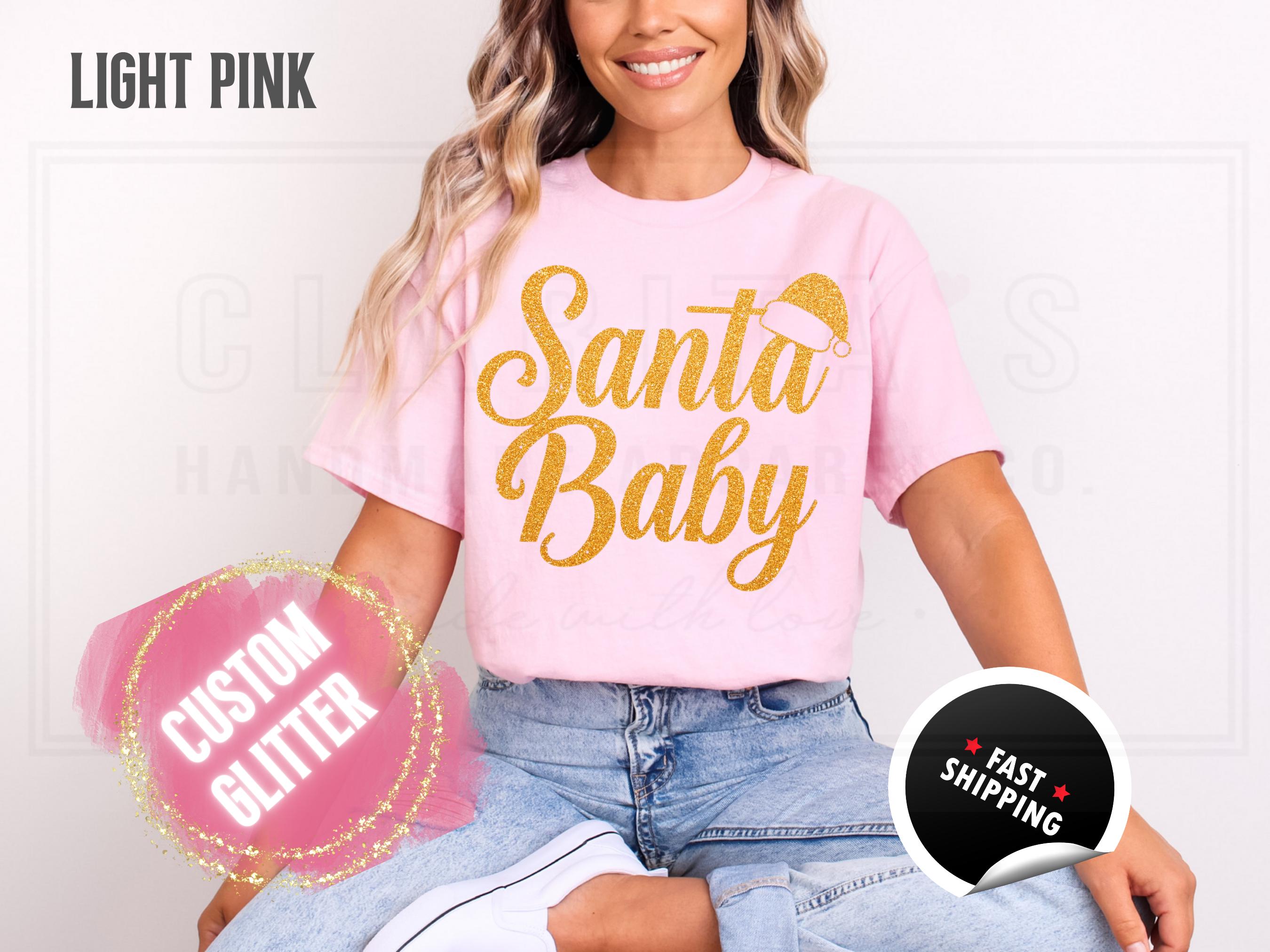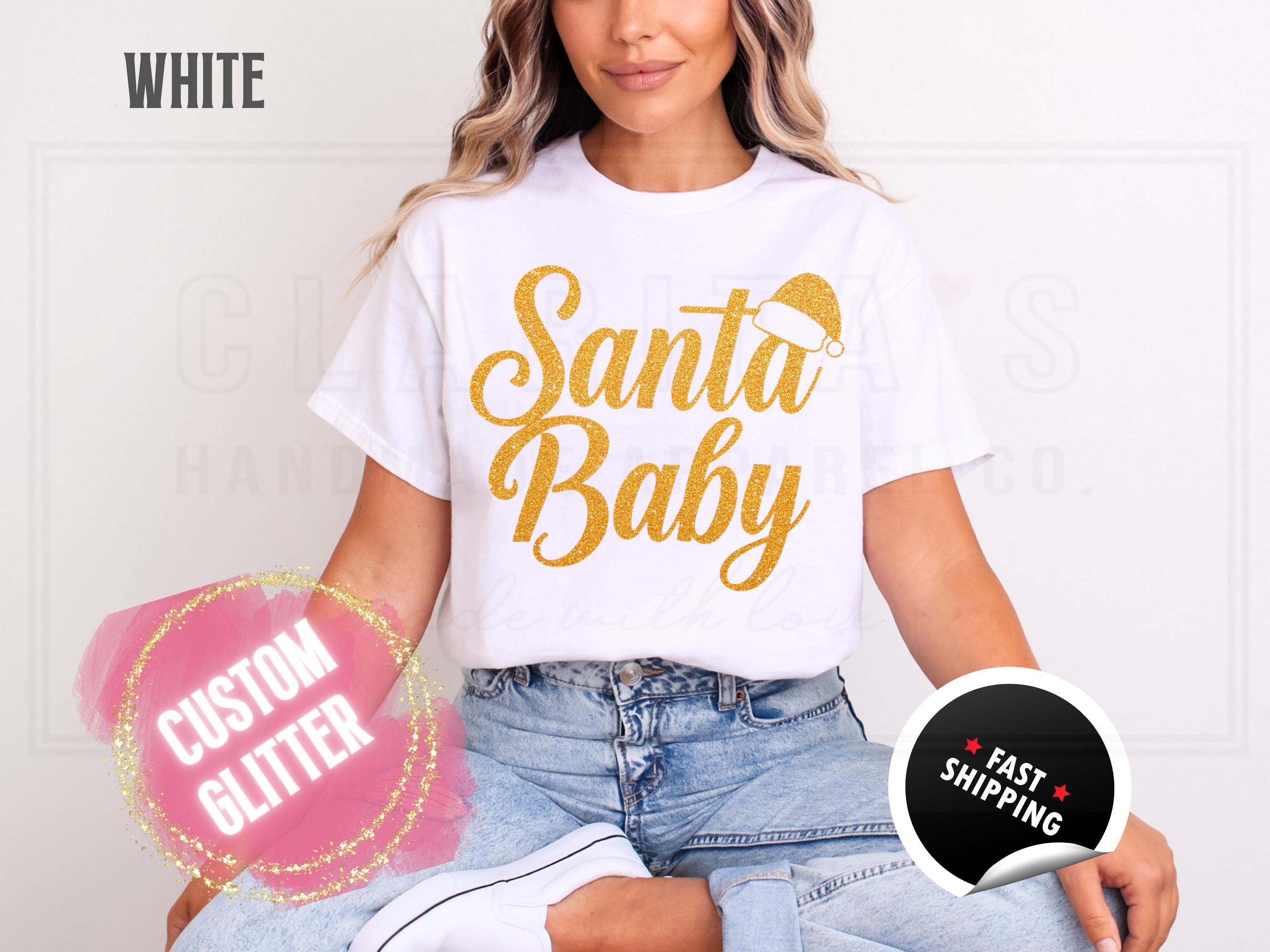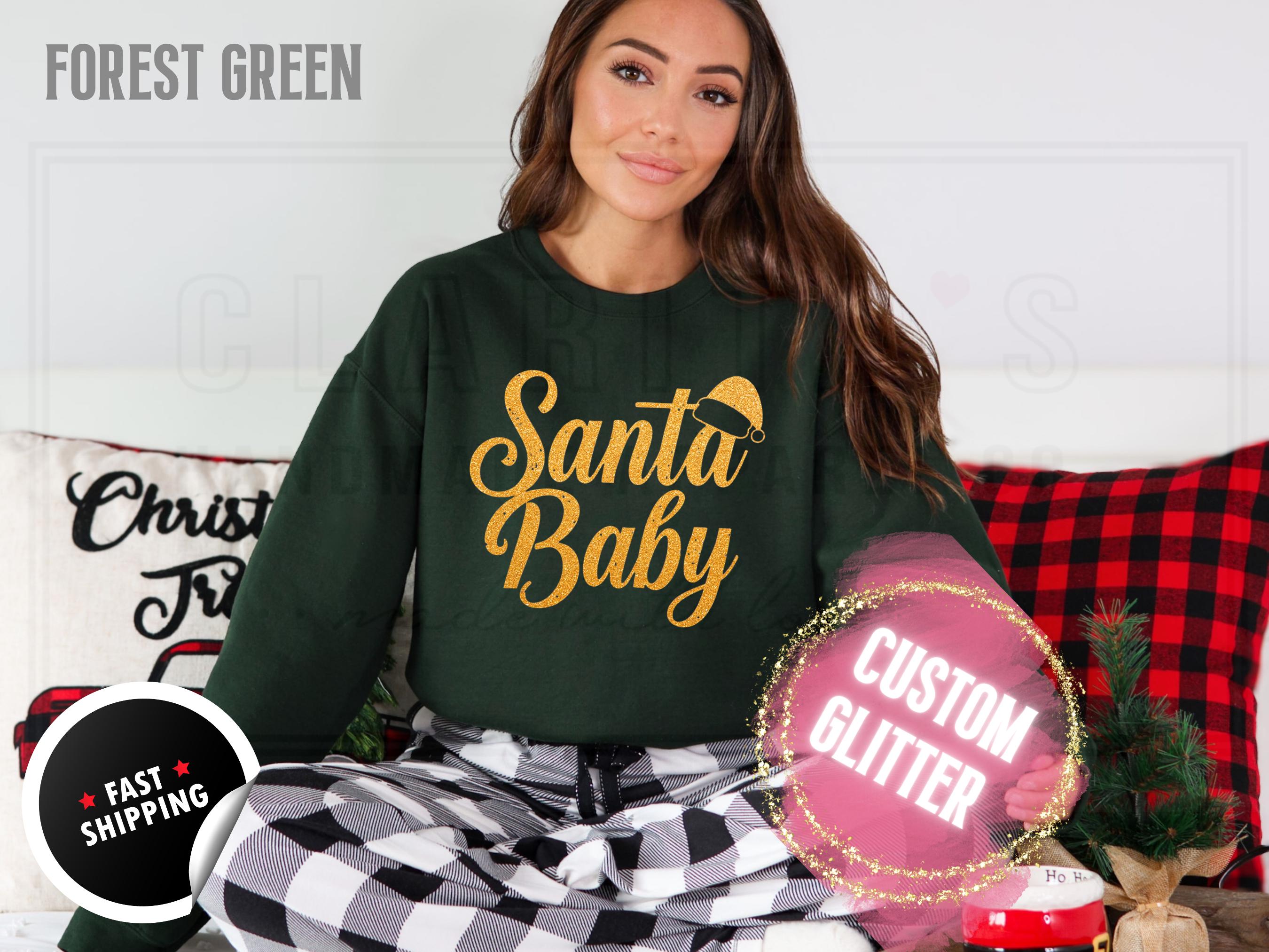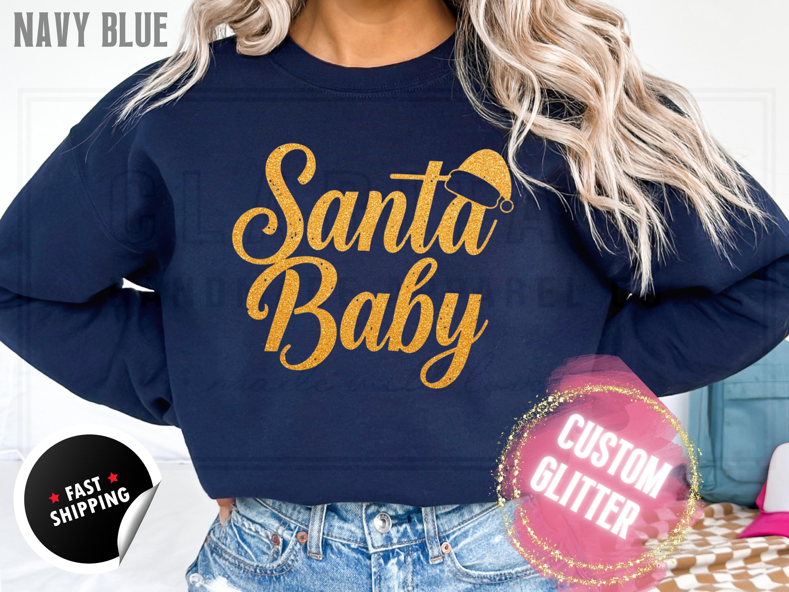 Glitter Christmas Sweatshirt and T-Shirts: ''Santa Baby" Holiday Crewneck Sweater. Custom Color Glitzy Sparkling Festive Shirts for Women