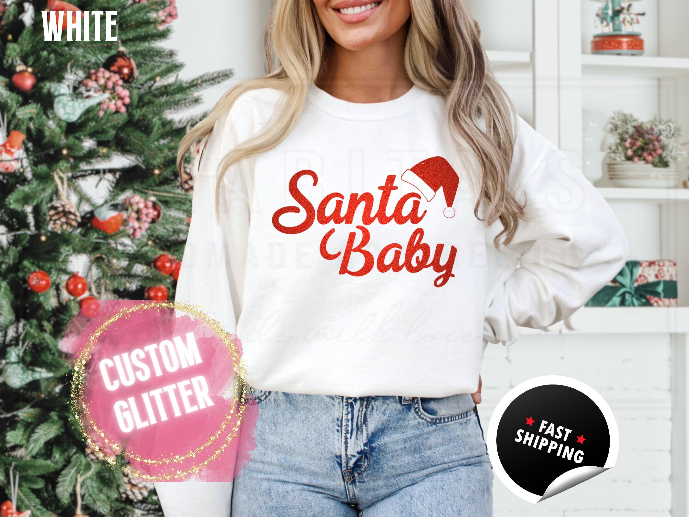 Glitter Christmas Sweatshirt and T-Shirts: ''Santa Baby" Holiday Crewneck Sweater. Custom Color Glitzy Sparkling Festive Shirts for Women